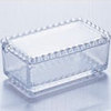 デザインが凄くキレイなので購入しました。ガラス製なので少し重さが気になりますが、それほど持ち歩いて使用するものではないので、あまり気にせず使用していますよ。縁の部分は繊細な装飾がしてあり、本体と蓋の部分にはバターナイフが置けるように穴が開いています。ガラスなので洗いやすいし、衛生的に使えるので便利ですよ。