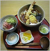 海老や茄子、サツマイモなど天ぷらが入ったきしめんと、四種類から選べる丼物のついたセットメニューです。きしめんが食べたくて頼みました。サクサクの天ぷらにコシのあるきしめん。これだけでも十分お腹いっぱいになります。