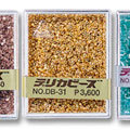 少量タイプは小さな密閉出来る筒に入りバラけず便利。鍍金などの色合い、加工によって値段にかなりの開きがあるが、遠めで見るとあまり変わらない微妙な違いではある。キラキラの光沢が素晴らしく、粒の揃いも見事。筒型で隙間なく編み上がり、テグスなどにそのまま通してもきちんと整列している使いやすいビーズ。値段の高いものは、光沢に不純なものが無い綺麗な光り具合。