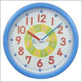 子供の勉強用にぴったりの時計。電池で動きます。長針のが示す時刻が 一分刻みで書いてあり色分けしてあるので、ひとめでわかりやすいと思います。赤い針は赤い字、青い針は青い字のところを読む、というふうに教えるだけなので簡単です。