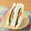 パンがふわふわで美味しい。レタスはシャッキシャキで食べ応えのあるヘルシーなサンドイッチです。味付けのソース類は少なめ、野菜とベーコンの味がわかるあっさりサンドイッチ。