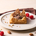 期間限定品です。見た目の印象よりもずっしりとしていました。濃厚なショコラクリームと果肉感のあるフランボワーズのコントラストが楽しめます。今回はホームパーティーのデザートとして半分にカットしたものを用意しましたが、それでも十分濃厚だったので、シェアして食べるのもいいかもしれません。オープンパイなのでカットも手間がかかりますが、コツを掴めばきれいに切れます。上に乗っているフロランタンも美味しいのですが、全体的にビジュアル重視で食べにくさがありました。